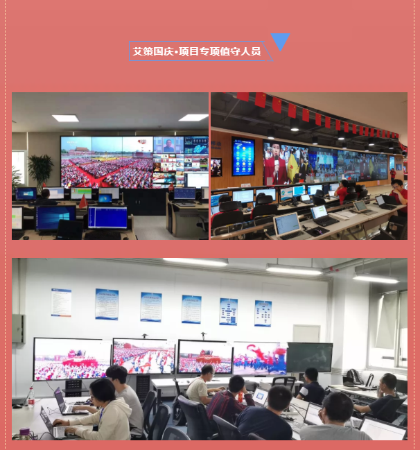 56門禮炮、70鳴響,震徹寰宇,在這場超燃閱兵式直播背后,艾策作為大視頻保障領先者,有這么一群艾策人放棄假期依然堅守在工作崗位上,用實際行動向偉大祖國建國70周年獻禮。節前,艾策通訊即發出通知,就新中國成立70周年大慶期間各集團業務安全穩定運行工作進行了詳細安排部署,明確重點保障工作任務,同時成立由項目專職值守人員和后端研發專家聯合組建的艾策專項保障團隊,全力確保在國慶期間以更優質的服務提供更全面的支撐保障工作。