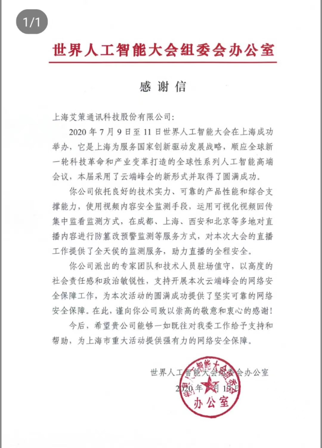 11日下午18:00,大會圓滿結(jié)束,艾策通訊辦公室里響起了保障支撐團隊的熱烈掌聲,在祝賀2020世界人工智能大會圓滿舉行的同時,也為艾策通訊的完美保障喝彩。在2020年7月17日,大會組委會專程致函我公司,對我公司優(yōu)良的技術(shù)實力,可靠的產(chǎn)品性能、強大的支撐能力表示了肯定和感謝。